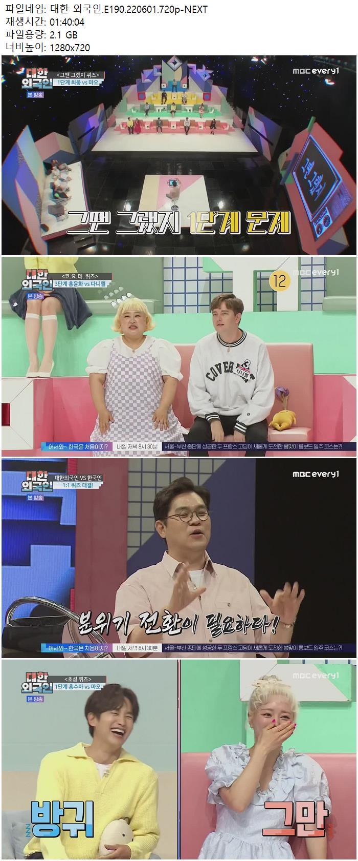 | 대한 외국인.E190.220601.720p-NEXT.mp4 | 2.1 G | 01:40:04 | 1280x720 |