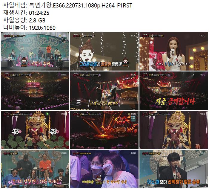 | 복면가왕.E366.220731.1080p.H264-F1RST.mp4 | 2.8 G | 01:24:25 | 1920x1080 |