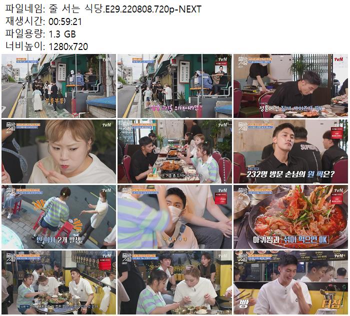 | 줄 서는 식당.E29.220808.720p-NEXT.mp4 | 1.3 G | 00:59:21 | 1280x720 |