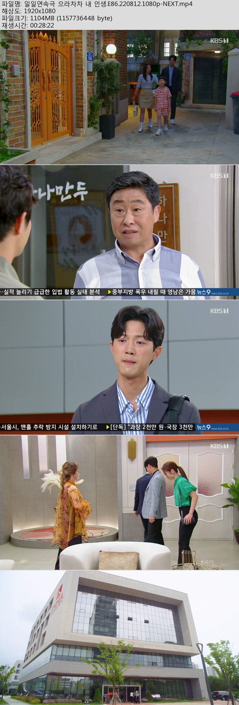 | 일일연속극 으라차차 내 인생.E86.220812.1080p-NEXT.mp4 | 1.1 G | 00:28:22 | 1920x1080 |