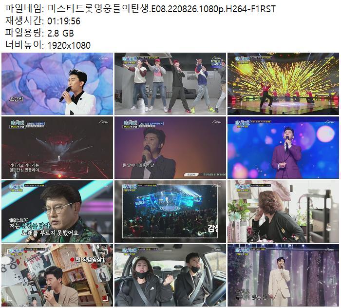 | 미스터트롯영웅들의탄생.E08.220826.1080p.H264-F1RST.mp4 | 2.8 G | 01:19:56 | 1920x1080 |