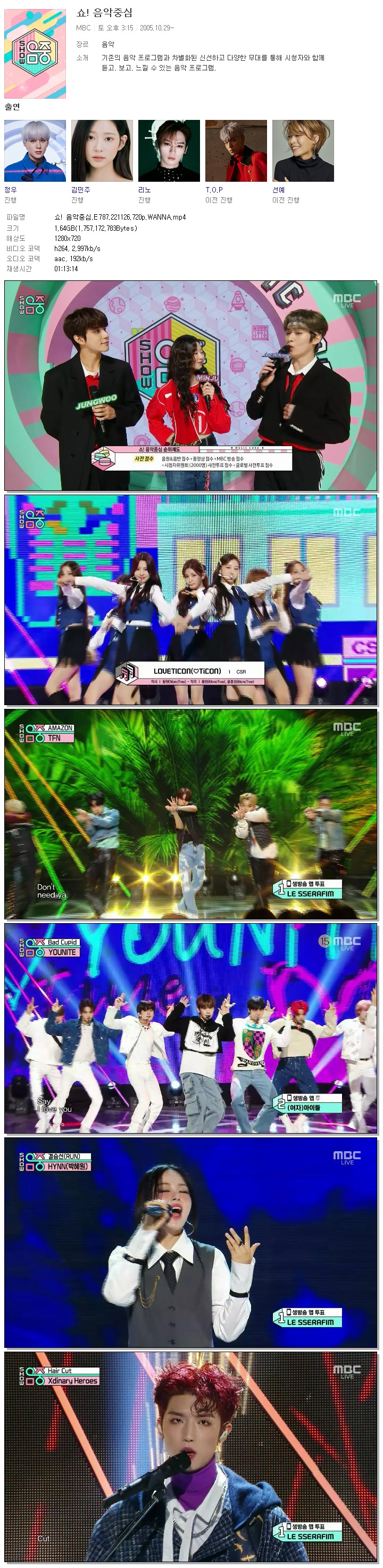 | 쇼! 음악중심.E787.221126.720p.WANNA.mp4 | 1.6 G | 01:13:14 | 1280x720 |