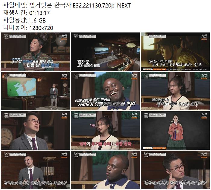 | 벌거벗은 한국사.E32.221130.720p-NEXT.mp4 | 1.6 G | 01:13:17 | 1280x720 |