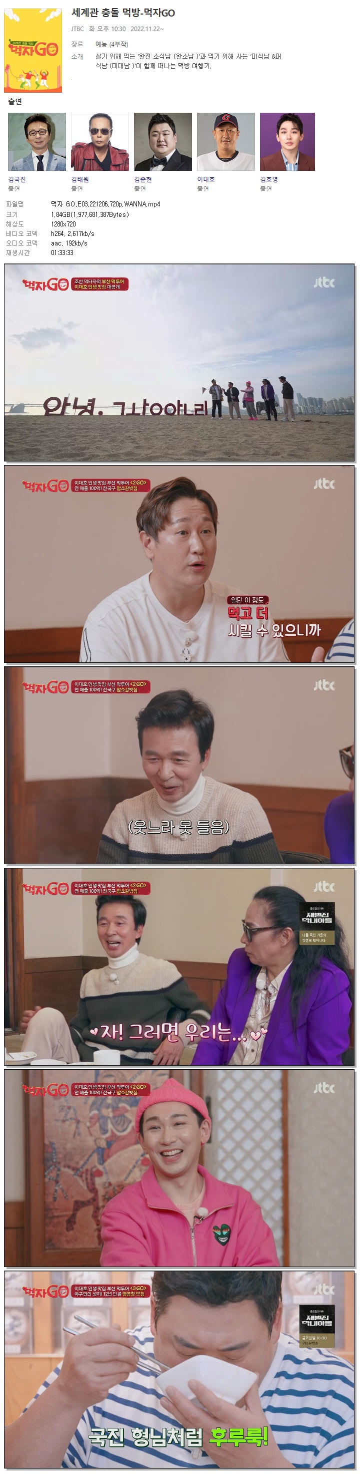 | 먹자 GO.E03.221206.720p.WANNA.mp4 | 1.8 G | 01:33:33 | 1280x720 |