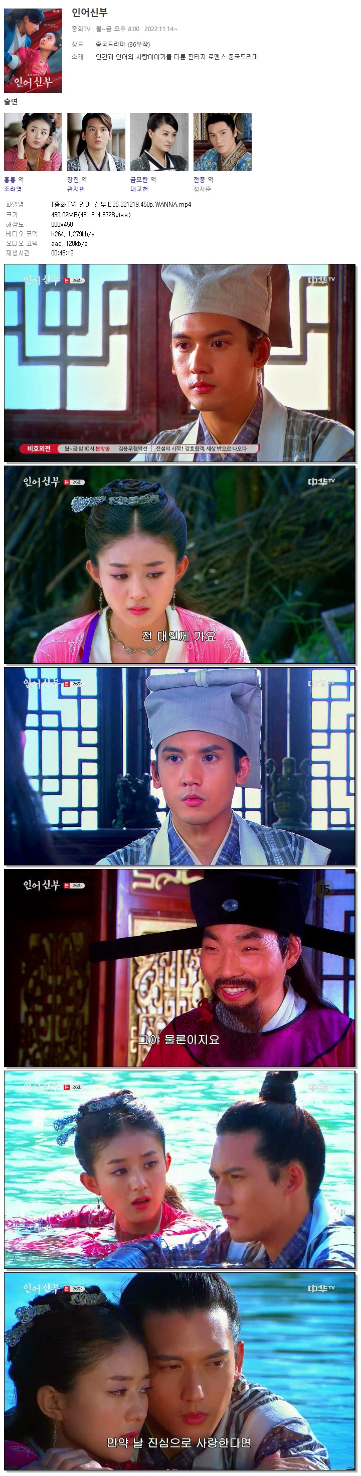 [중화TV] 인어 신부.E26.221219.450p.WANNA.mp4 459 M 00:45:19 800x450