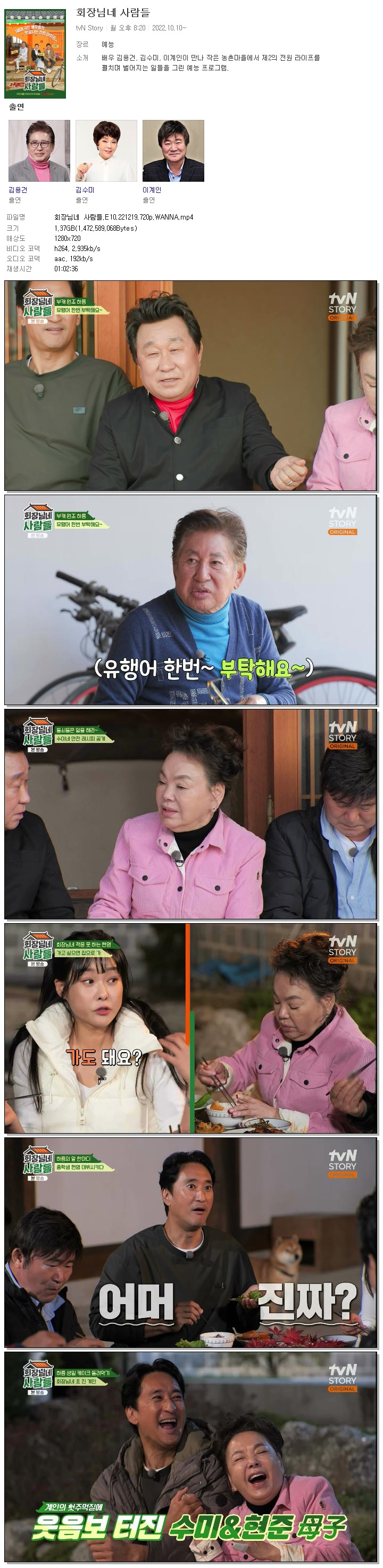 | 회장님네 사람들.E10.221219.720p.WANNA.mp4 | 1.4 G | 01:02:36 | 1280x720 |