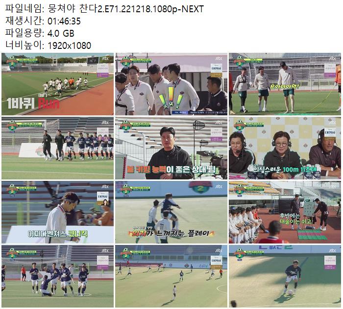 | 뭉쳐야 찬다2.E71.221218.1080p-NEXT.mp4 | 4 G | 01:46:35 | 1920x1080 |