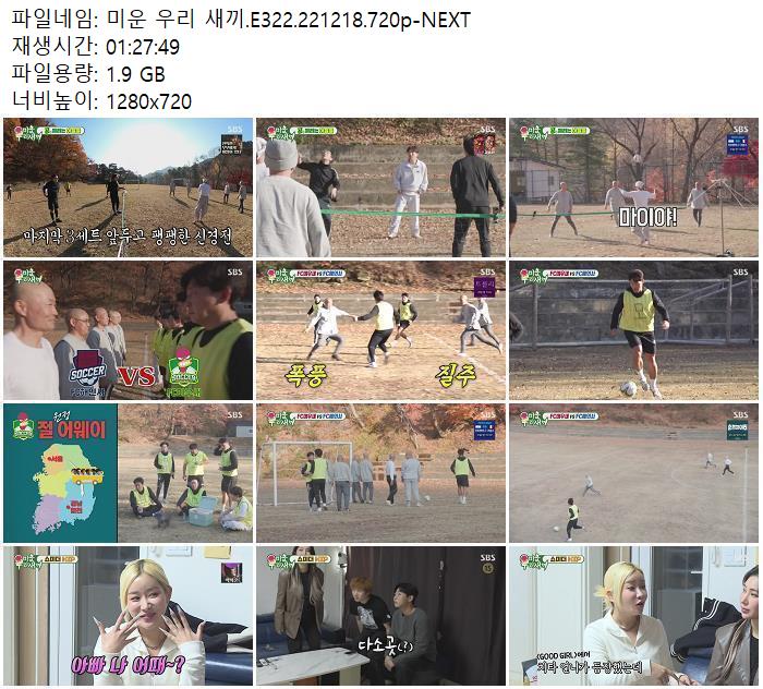 | 미운 우리 새끼.E322.221218.720p-NEXT.mp4 | 1.9 G | 01:27:49 | 1280x720 |