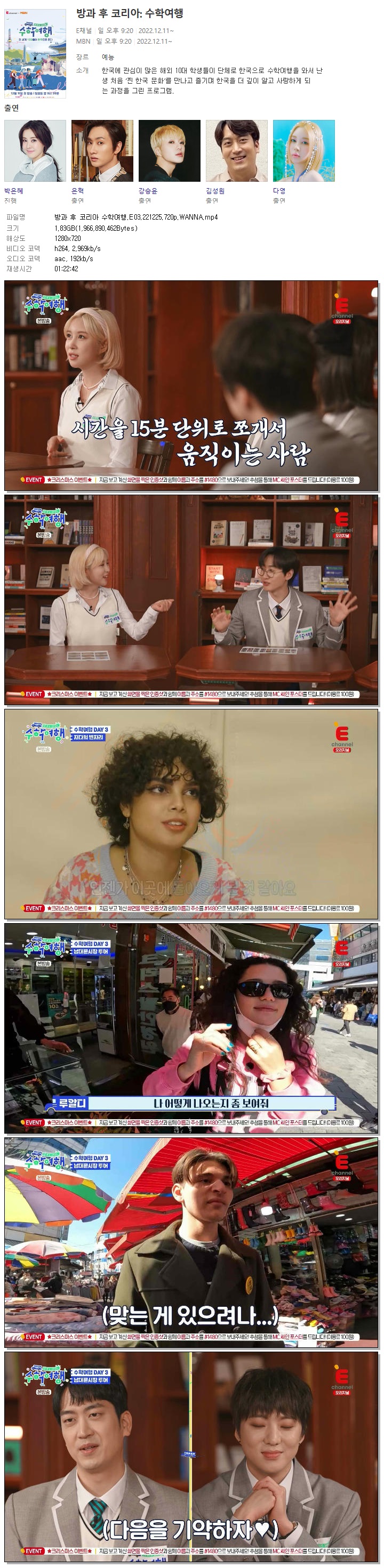 | 방과 후 코리아 수학여행.E03.221225.720p.WANNA.mp4 | 1.8 G | 01:22:42 | 1280x720 |