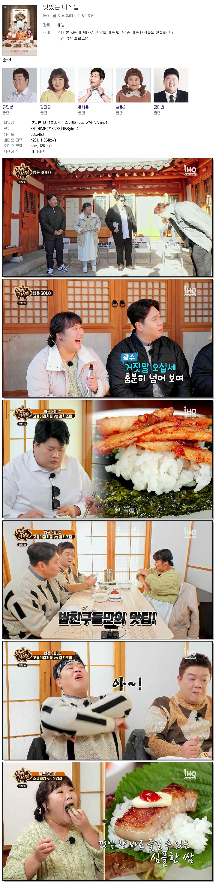 | 맛있는 녀석들.E411.230106.450p.WANNA.mp4 | 680.7 M | 01:06:57 | 800x450 |
