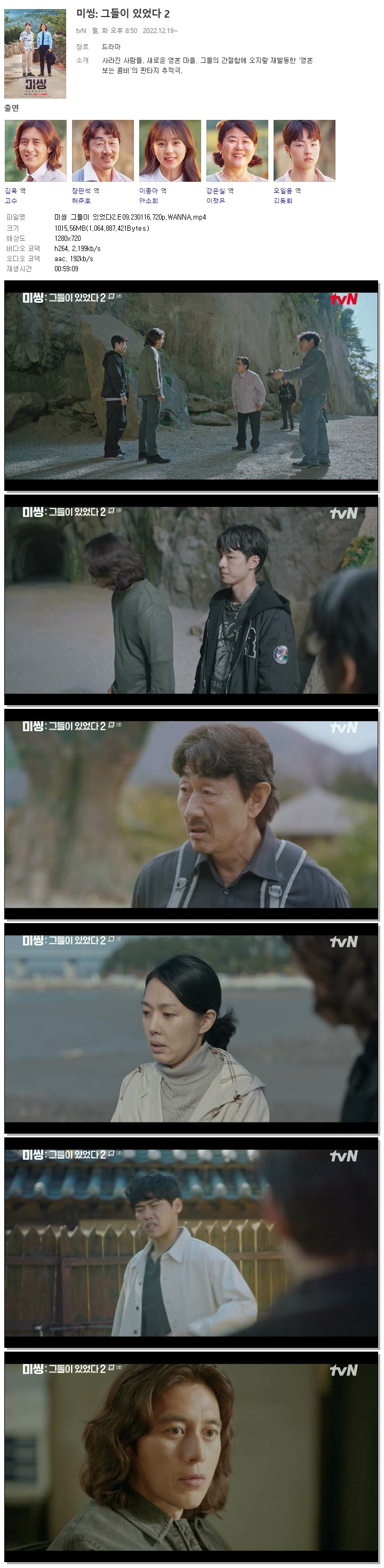 | 미씽 그들이 있었다2.E09.230116.720p.WANNA.mp4 | 1015.6 M | 00:59:09 | 1280x720 |