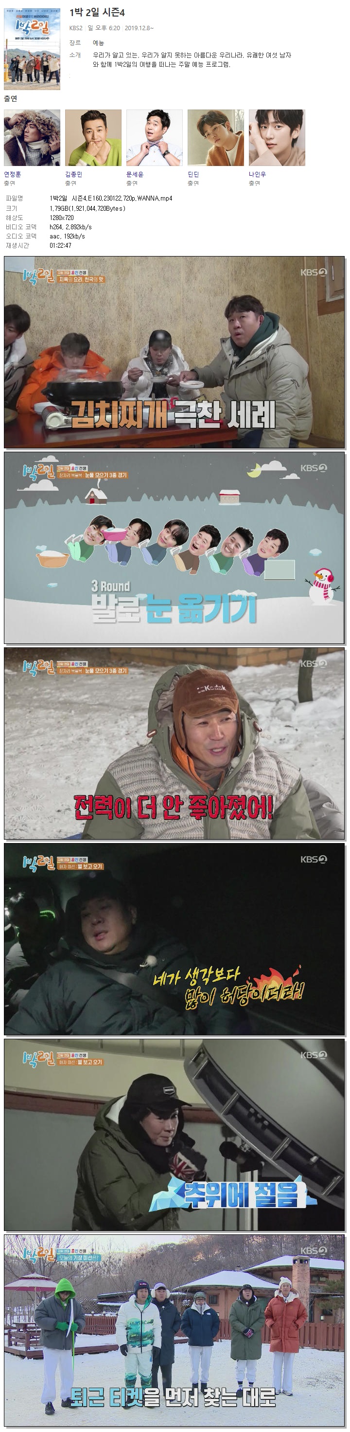 | 1박2일 시즌4.E160.230122.720p.WANNA.mp4 | 1.8 G | 01:22:47 | 1280x720 |