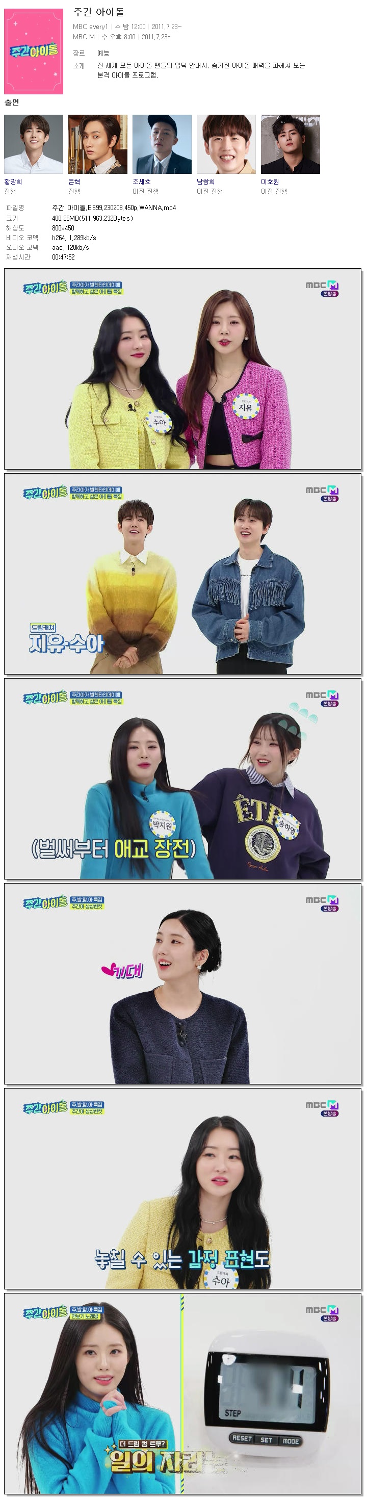 | 주간 아이돌.E599.230208.450p.WANNA.mp4 | 488.2 M | 00:47:52 | 800x450 |