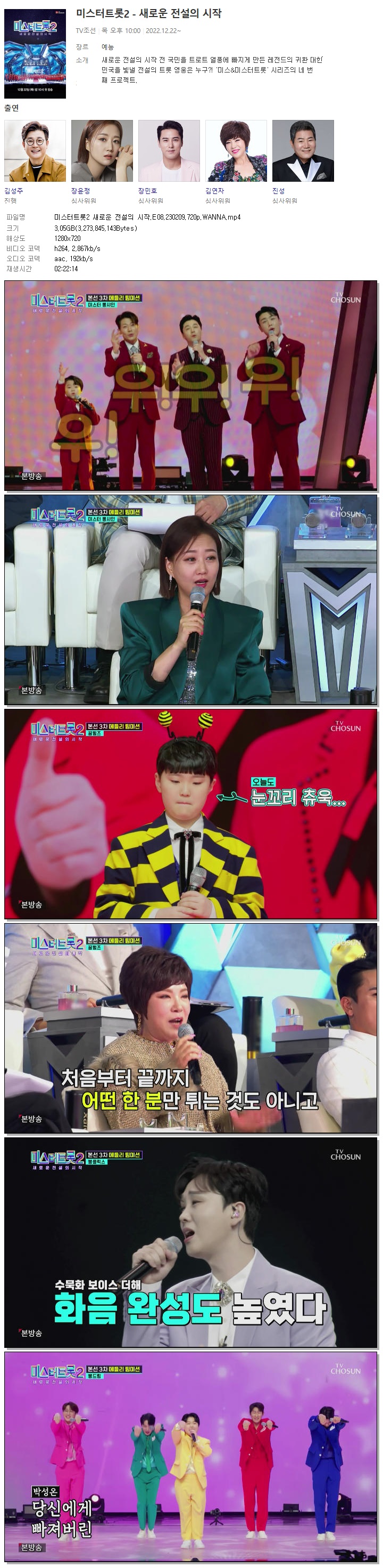 | 미스터트롯2 새로운 전설의 시작.E08.230209.720p.WANNA.mp4 | 3 G | 02:22:14 | 1280x720 |