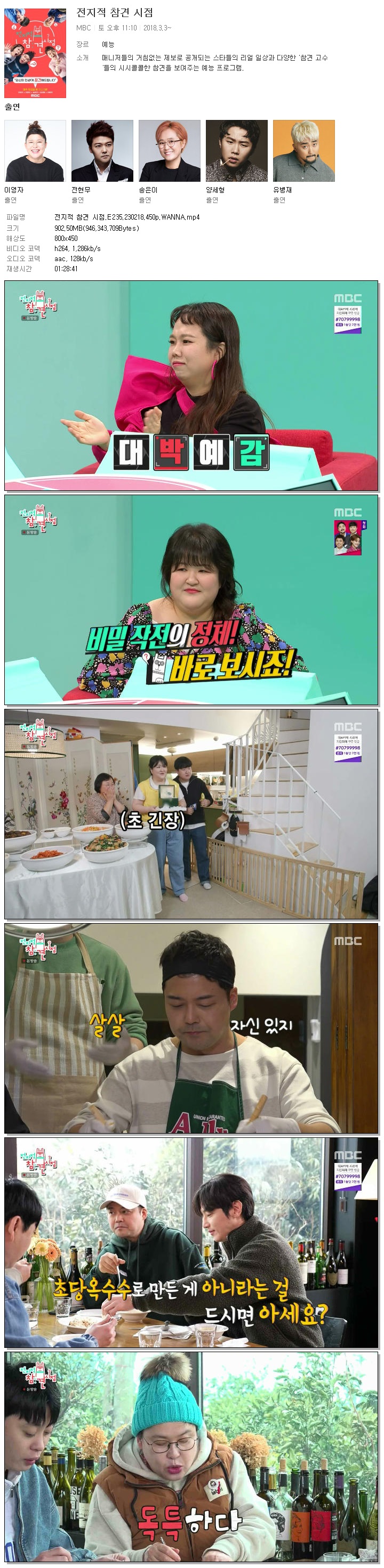 | 전지적 참견 시점.E235.230218.450p.WANNA.mp4 | 902.5 M | 01:28:41 | 800x450 |