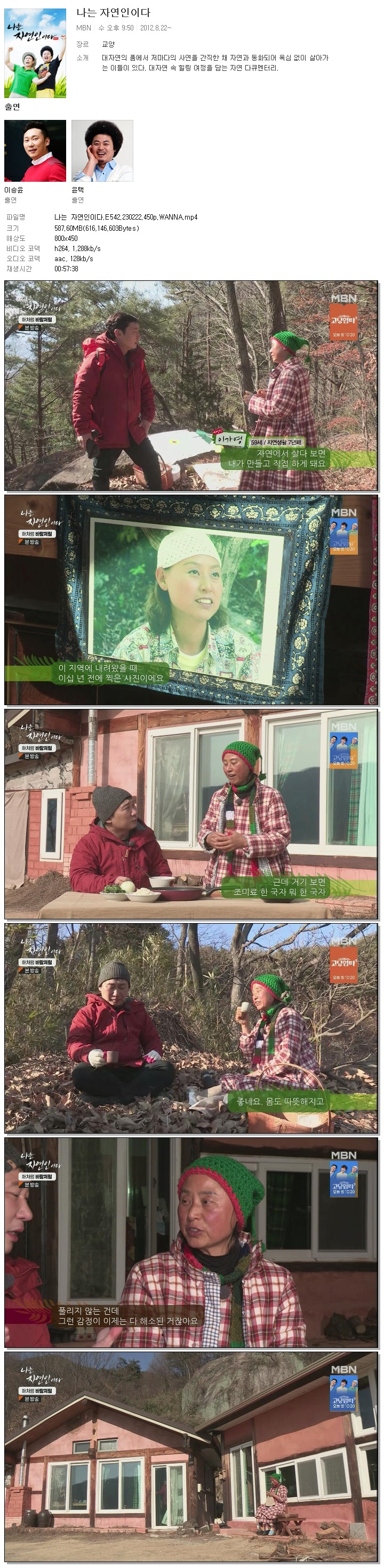 | 나는 자연인이다.E542.230222.450p.WANNA.mp4 | 587.6 M | 00:57:38 | 800x450 |