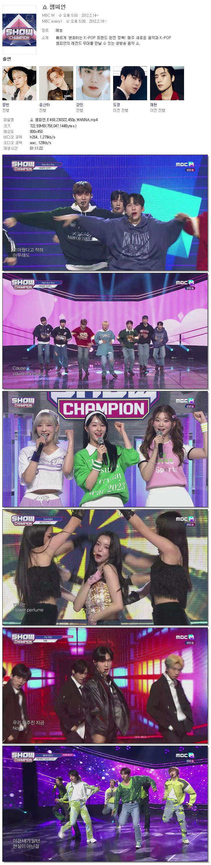 | 쇼 챔피언.E468.230322.450p.WANNA.mp4 | 722.9 M | 01:11:22 | 800x450 |