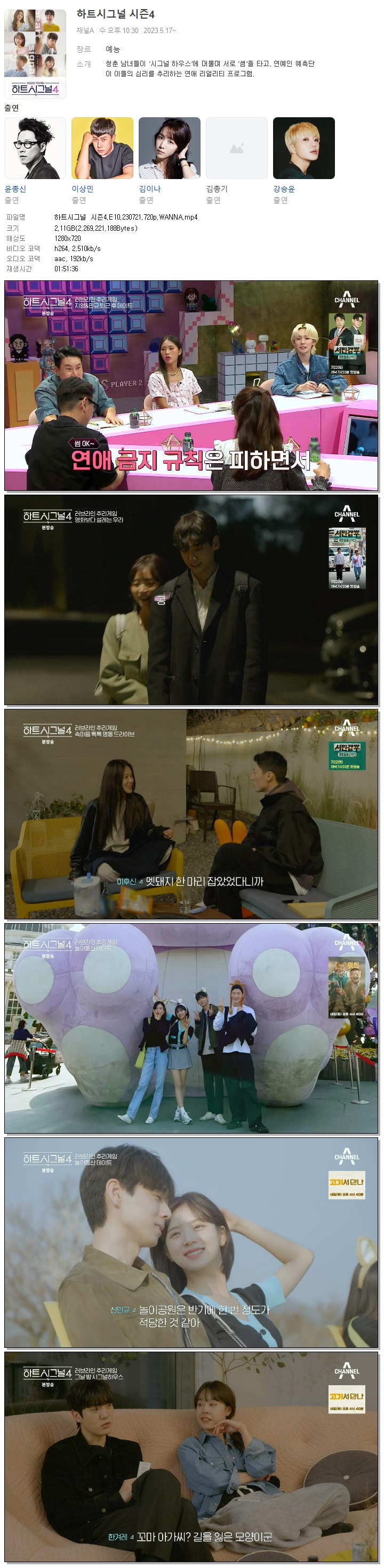 | 하트시그널 시즌4.E10.230721.720p.WANNA.mp4 | 2.1 G | 01:51:36 | 1280x720 |