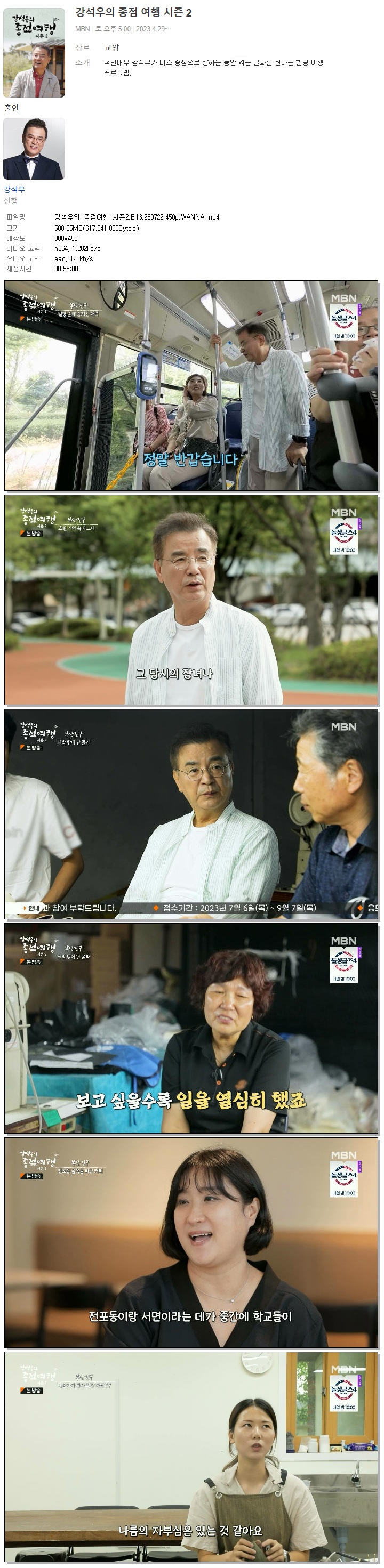 | 강석우의 종점여행 시즌2.E13.230722.450p.WANNA.mp4 | 588.6 M | 00:58:00 | 800x450 |