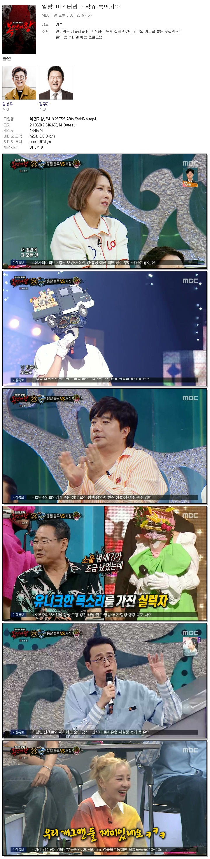 | 복면가왕.E413.230723.720p.WANNA.mp4 | 2.2 G | 01:37:19 | 1280x720 |