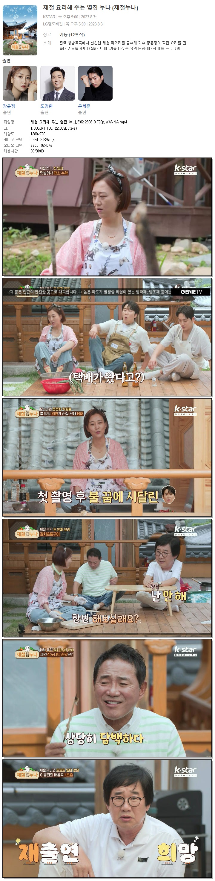 | 제철 요리해 주는 옆집 누나.E02.230810.720p.WANNA.mp4 | 1.1 G | 00:50:03 | 1280x720 |