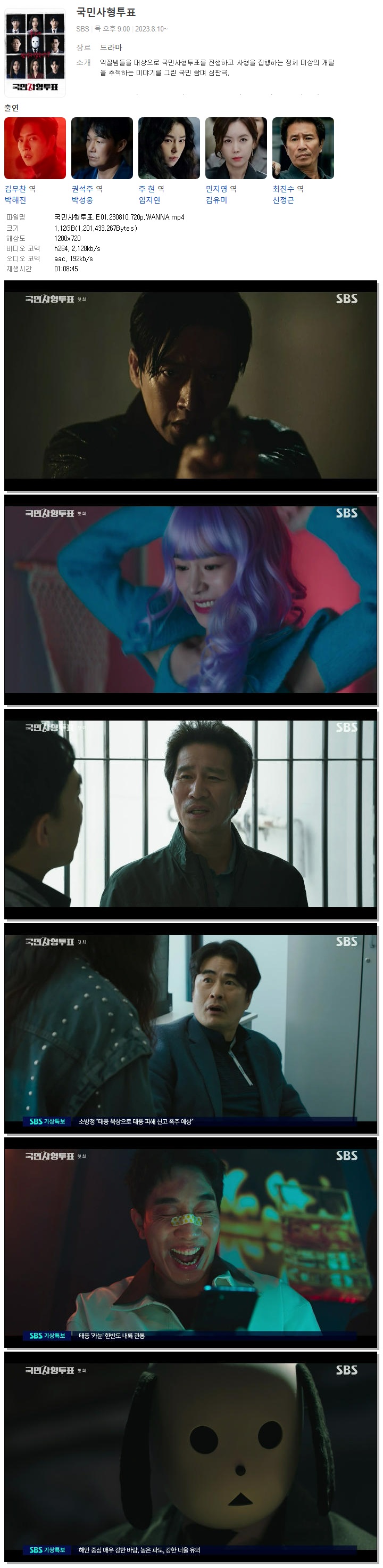 | 국민사형투표.E01.230810.720p.WANNA.mp4 | 1.1 G | 01:08:45 | 1280x720 |
