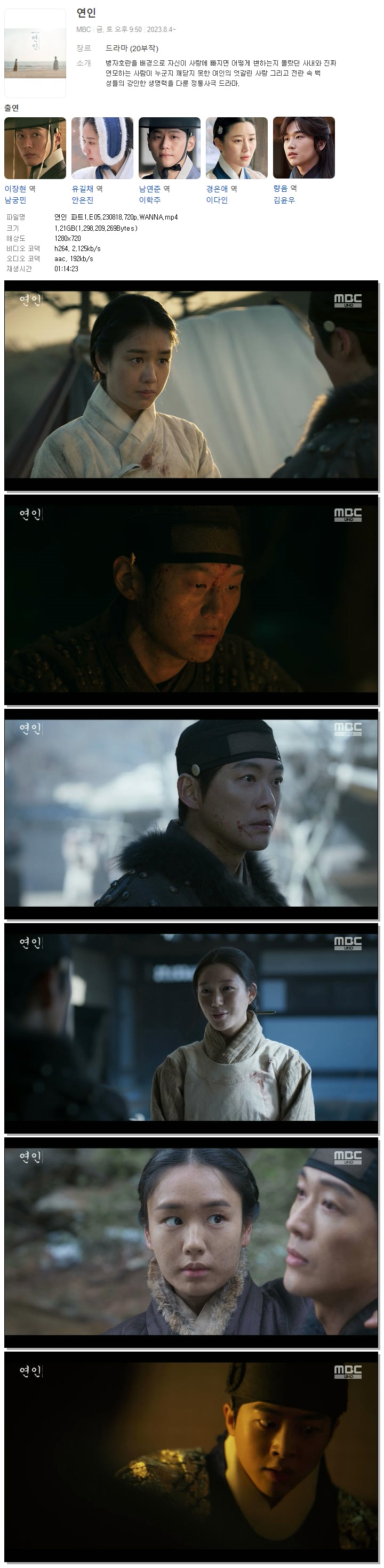 | 연인 파트1.E05.230818.720p.WANNA.mp4 | 1.2 G | 01:14:23 | 1280x720 |