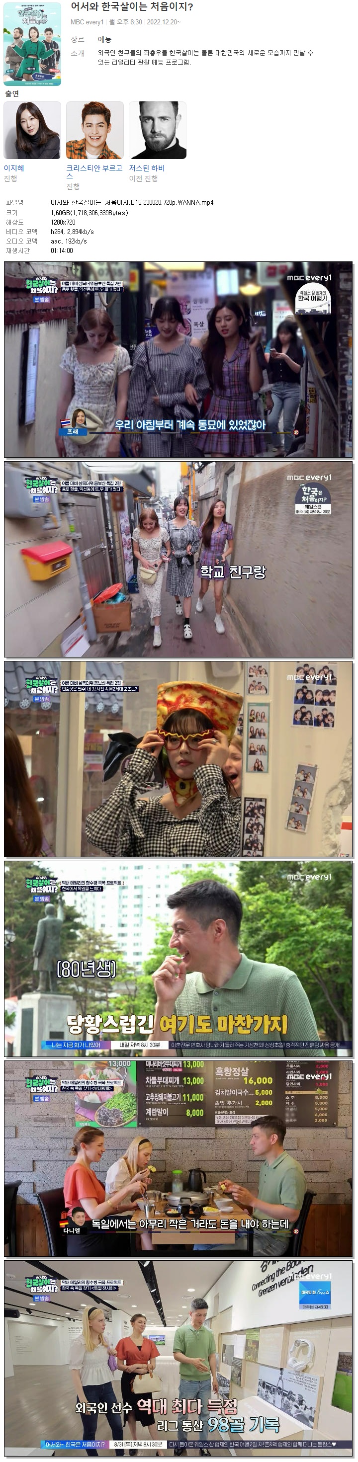 | 어서와 한국살이는 처음이지.E15.230828.720p.WANNA.mp4 | 1.6 G | 01:14:00 | 1280x720 |