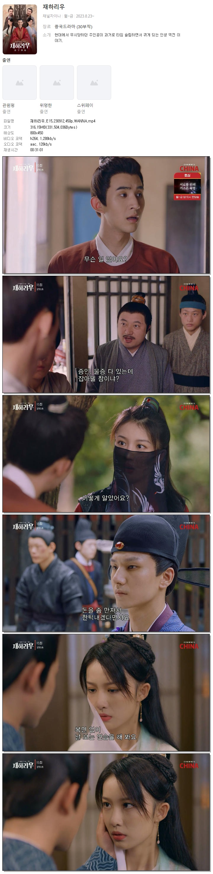 | 재하리우.E15.230912.450p.WANNA.mp4 | 316.1 M | 00:31:01 | 800x450 |