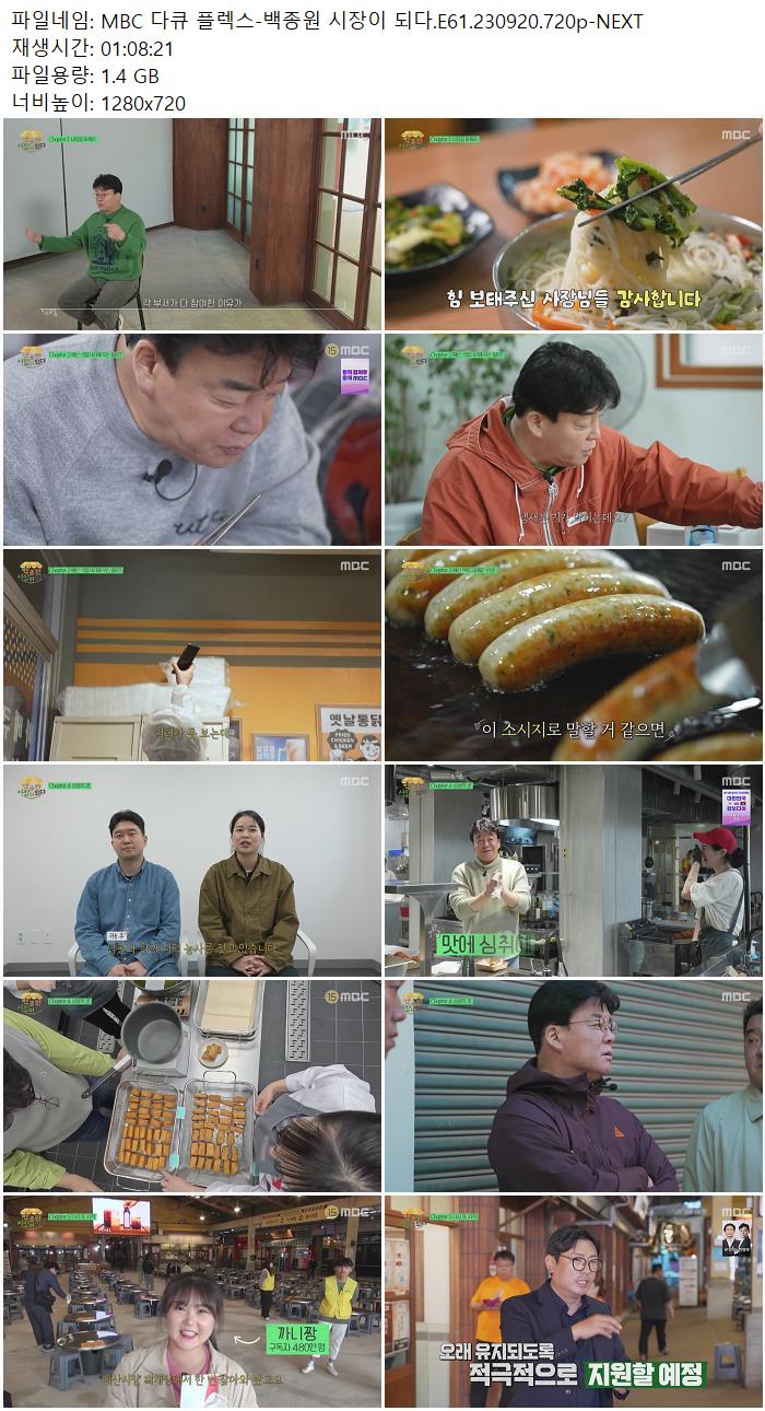 | MBC 다큐 플렉스-백종원 시장이 되다.E61.230920.720p-NEXT.mp4 | 1.4 G | 01:08:00 | 1280x720 |