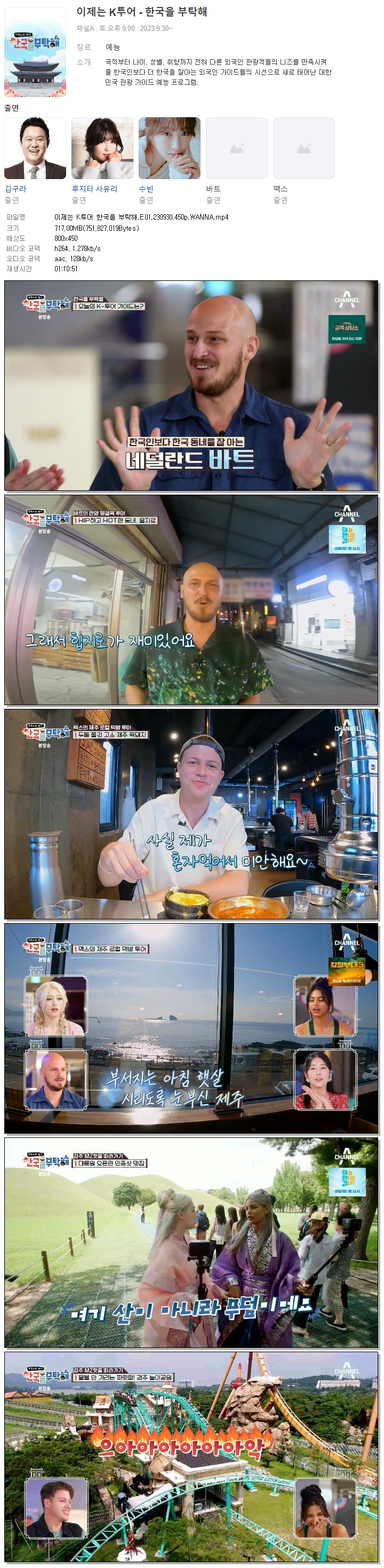 | 이제는 K투어 한국을 부탁해.E01.230930.450p.WANNA.mp4 | 717 M | 01:10:51 | 800x450 |
