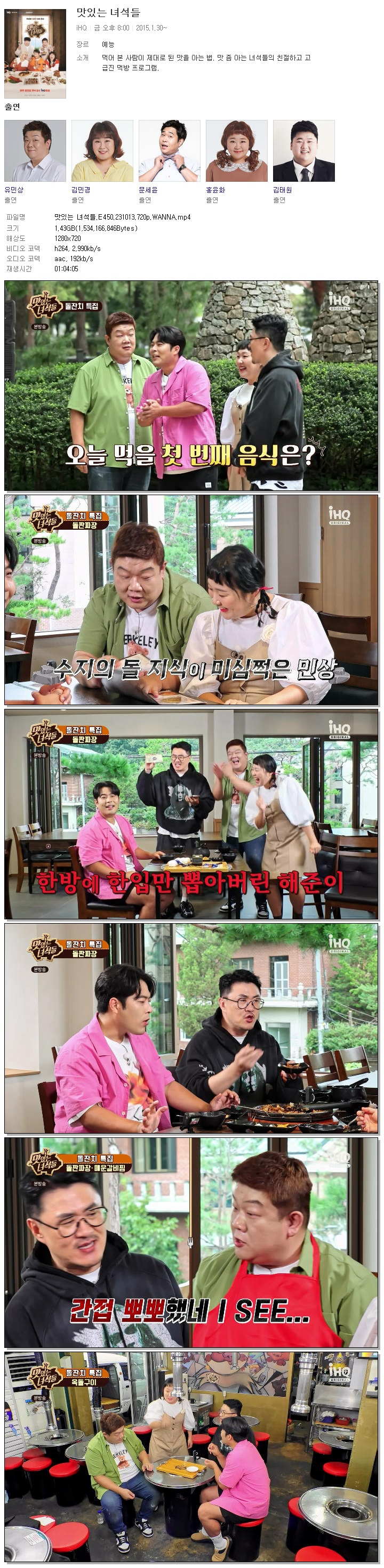 | 맛있는 녀석들.E450.231013.720p.WANNA.mp4 | 1.4 G | 01:04:05 | 1280x720 |