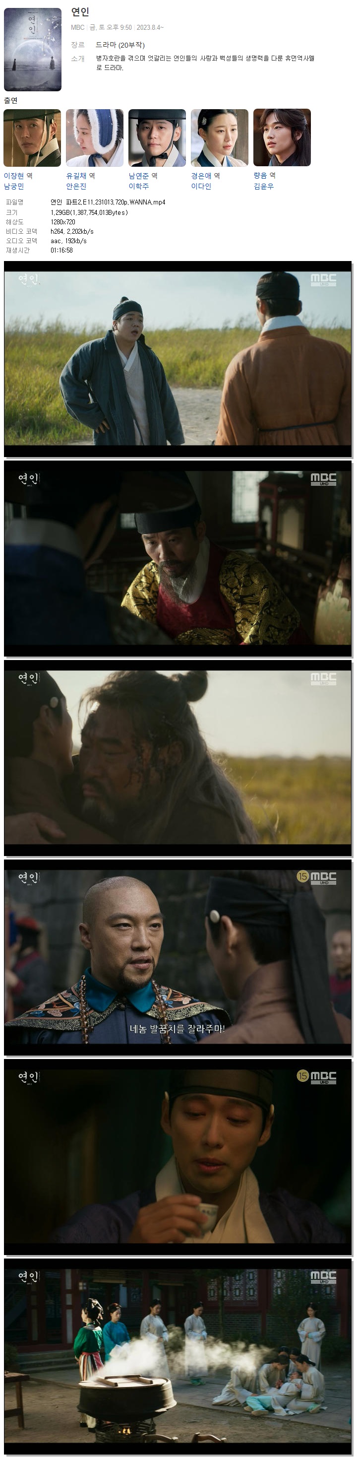 | 연인 파트2.E11.231013.720p.WANNA.mp4 | 1.3 G | 01:16:58 | 1280x720 |