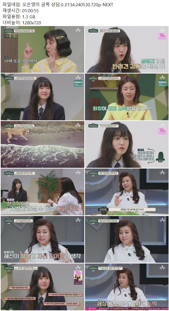 | 오은영의 금쪽 상담소.E134.240530.720p-NEXT.mp4 | 1.3 G | 01:00:00 | 1280x720 |