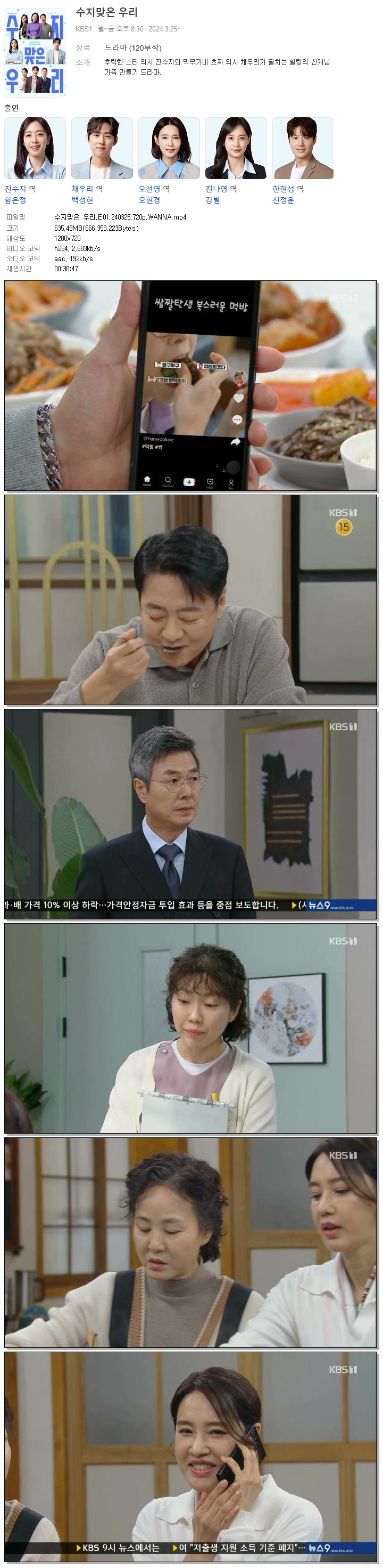 | 수지맞은 우리.E01.240325.720p.WANNA.mp4 | 635.5 M | 00:30:47 | 1280x720 |