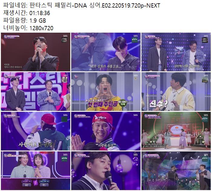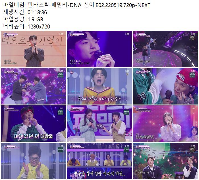 판타스틱 패밀리-DNA 싱어.E02.220519.720p-NEXT.mp4 1.9 G 01:18:36 1280x720