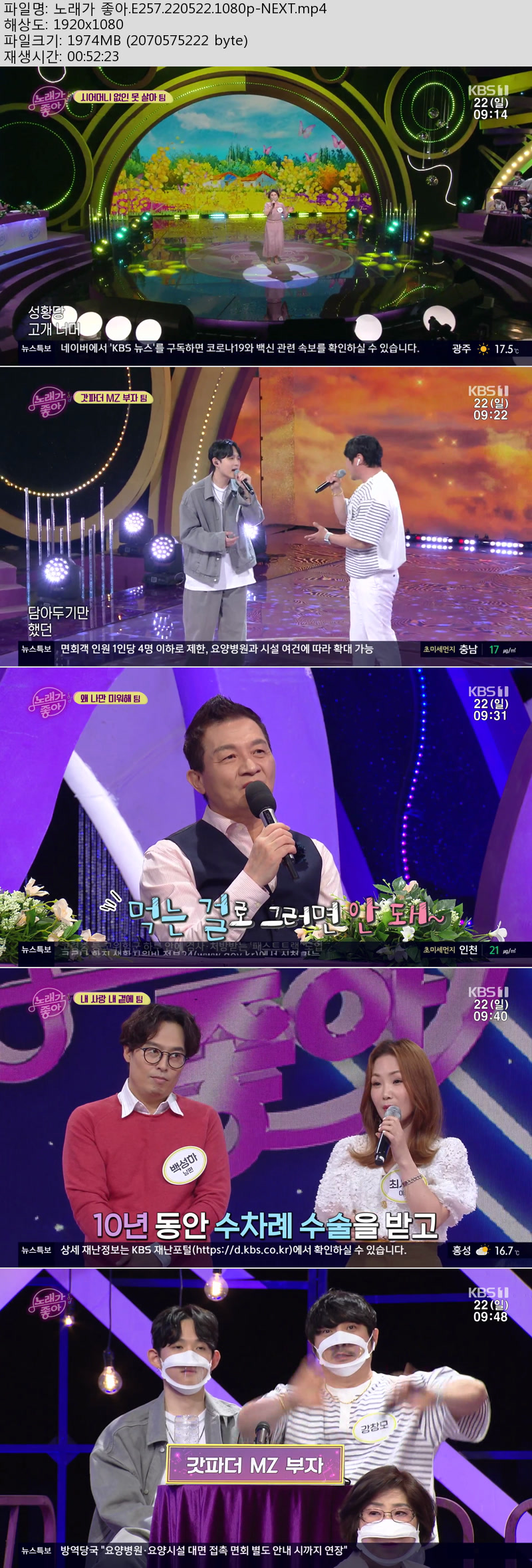| 노래가 좋아.E257.220522.1080p-NEXT.mp4 | 1.9 G | - | 1920x1080 |