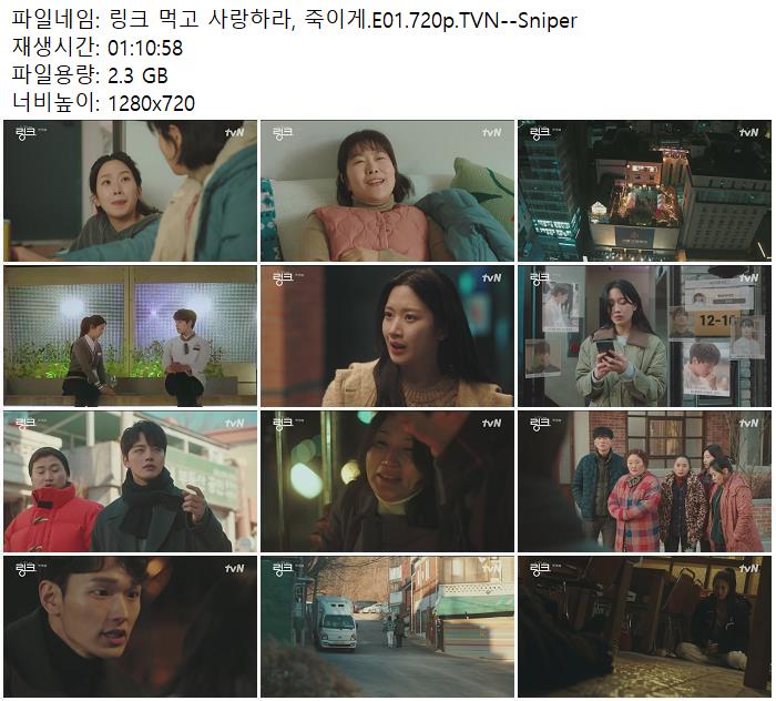 | 링크 먹고 사랑하라, 죽이게.E01.720p.TVN--Sniper.mp4 | 2.3 G | 01:10:58 | 1280x720 |
