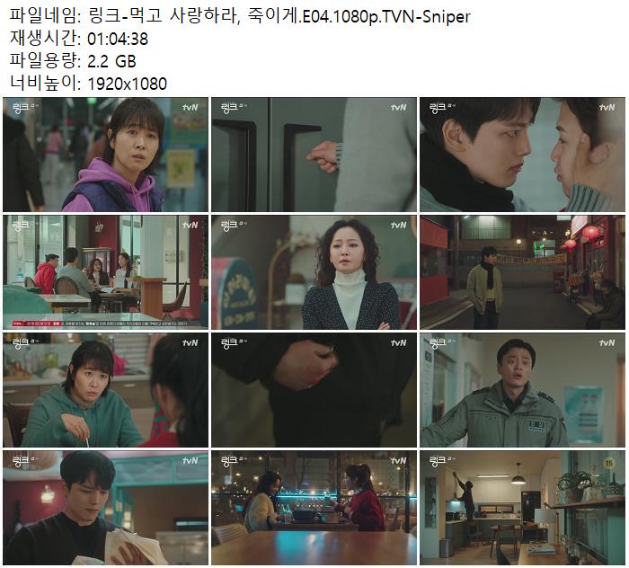 | 링크-먹고 사랑하라, 죽이게.E04.1080p.TVN-Sniper.mp4 | 2.2 G | 01:04:38 | 1920x1080 |
