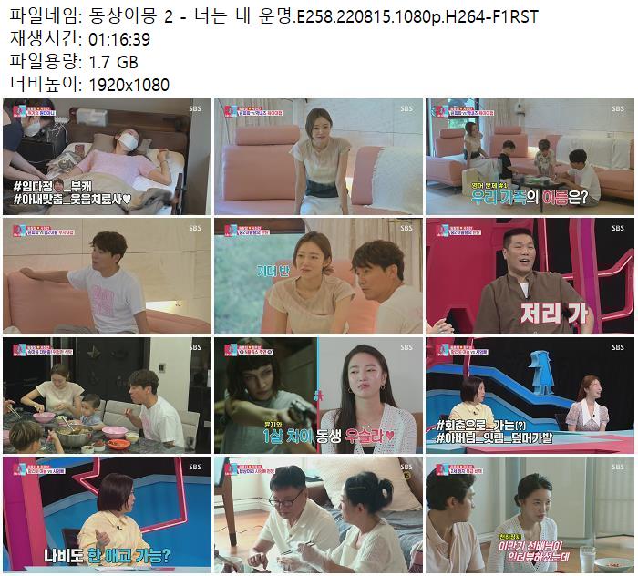 | 동상이몽 2 - 너는 내 운명.E258.220815.1080p.H264-F1RST.mp4 | 1.7 G | 01:16:39 | 1920x1080 |