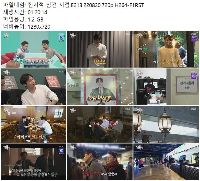 | 전지적 참견 시점.E213.220820.720p.H264-F1RST.mp4 | 1.2 G | 01:20:14 | 1280x720 |