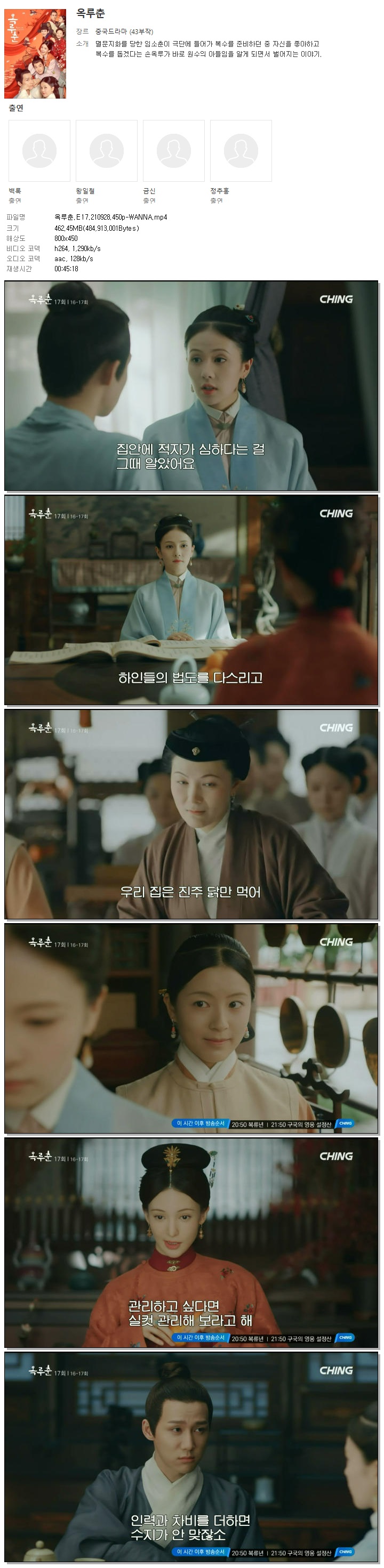 | 옥루춘.E17.210928.450p-WANNA.mp4 | 462.4 M | 00:45:18 | 800x450 |