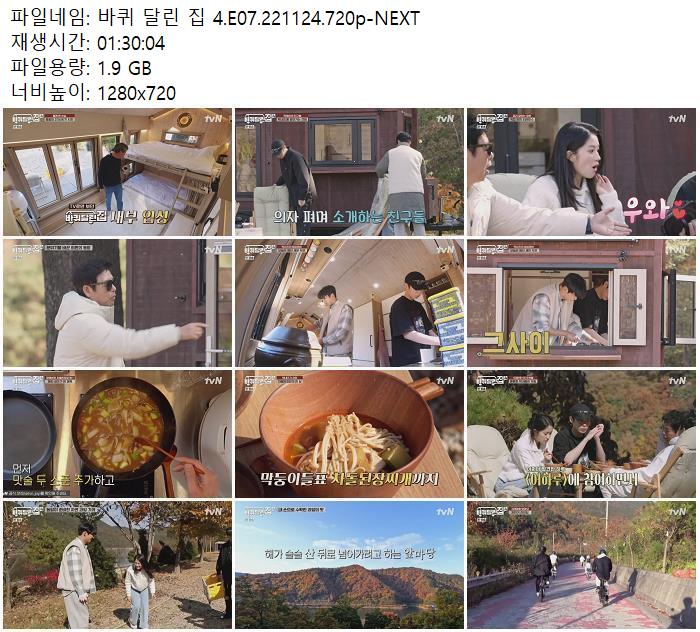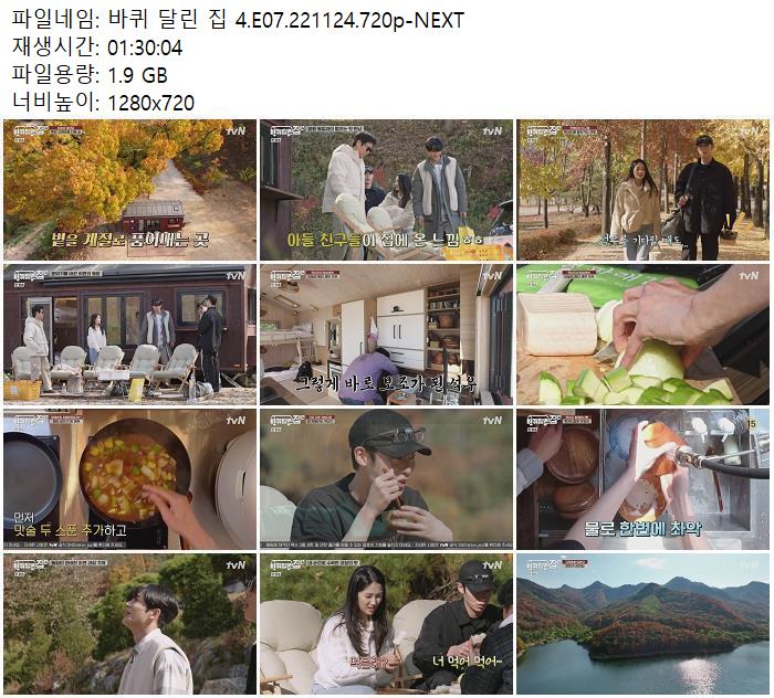 | 바퀴 달린 집 4.E07.221124.720p-NEXT.mp4 | 1.9 G | 01:30:04 | 1280x720 |