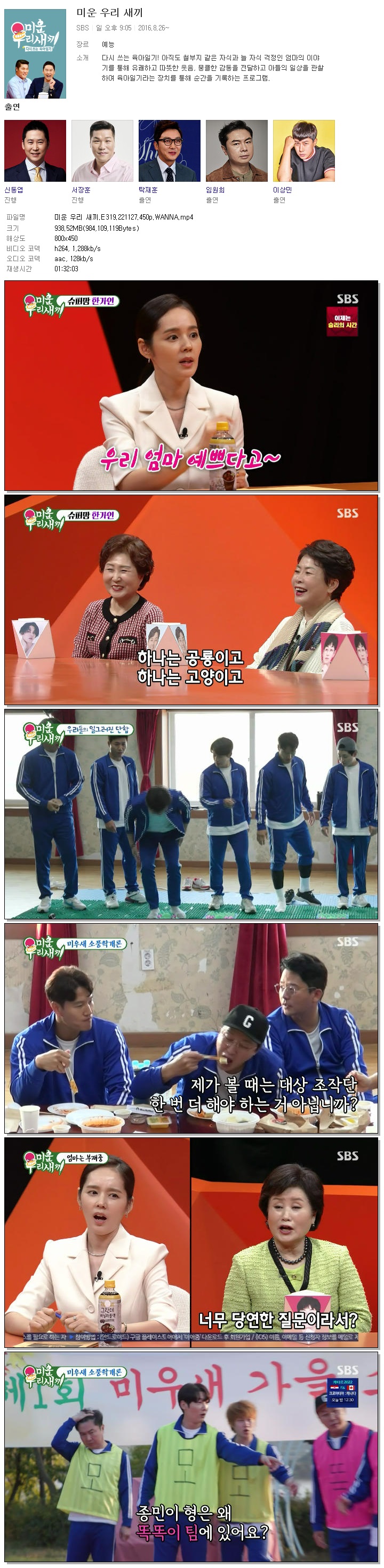 | 미운 우리 새끼.E319.221127.450p.WANNA.mp4 | 938.5 M | 01:32:03 | 800x450 |