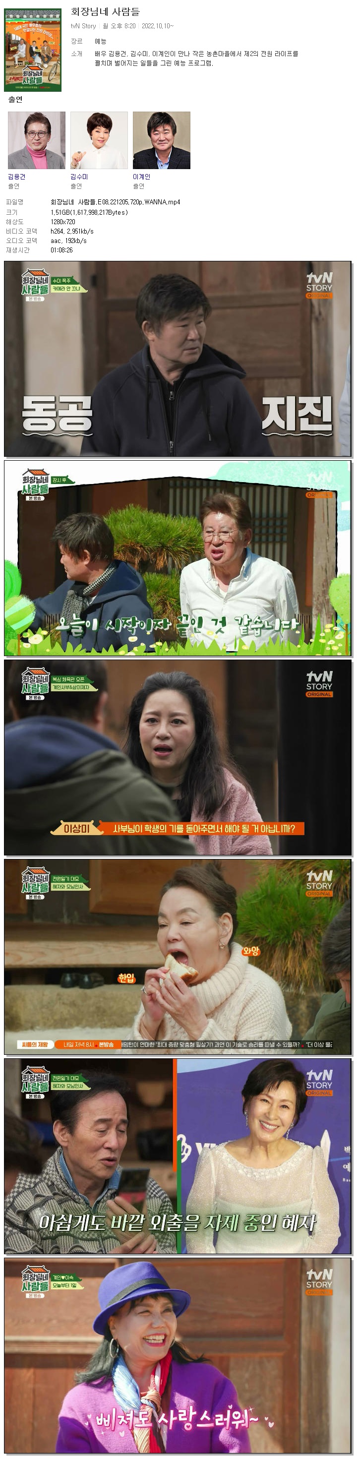 | 회장님네 사람들.E08.221205.720p.WANNA.mp4 | 1.5 G | 01:08:26 | 1280x720 |