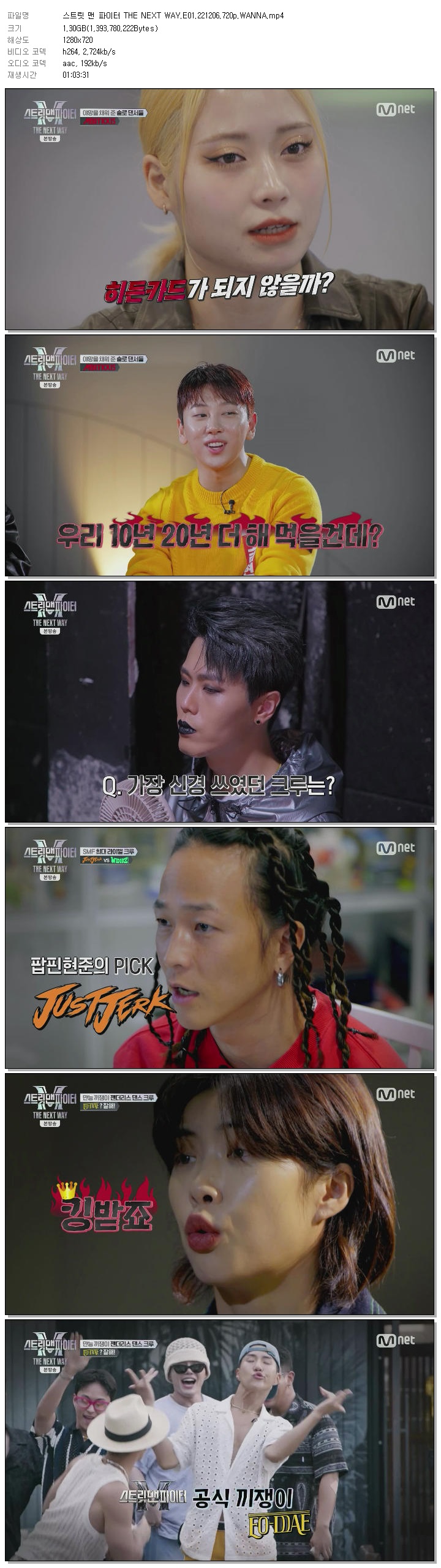 | 스트릿 맨 파이터 THE NEXT WAY.E01.221206.720p.WANNA.mp4 | 1.3 G | 01:03:31 | 1280x720 |