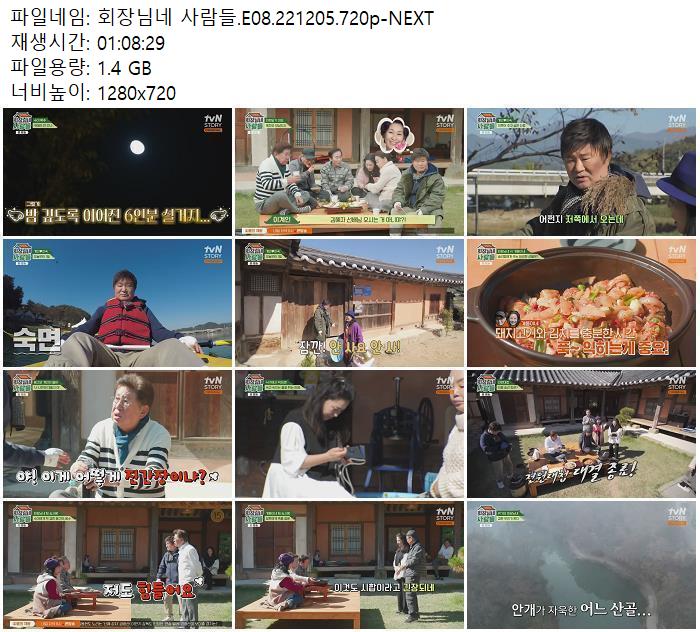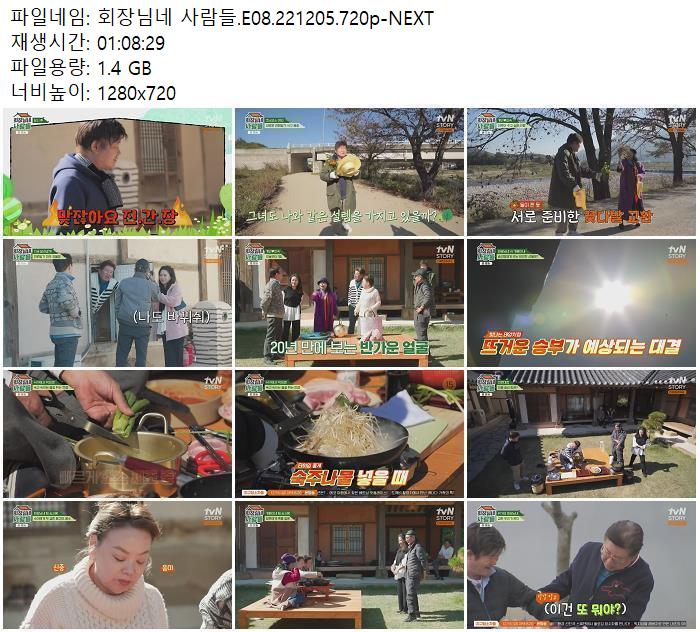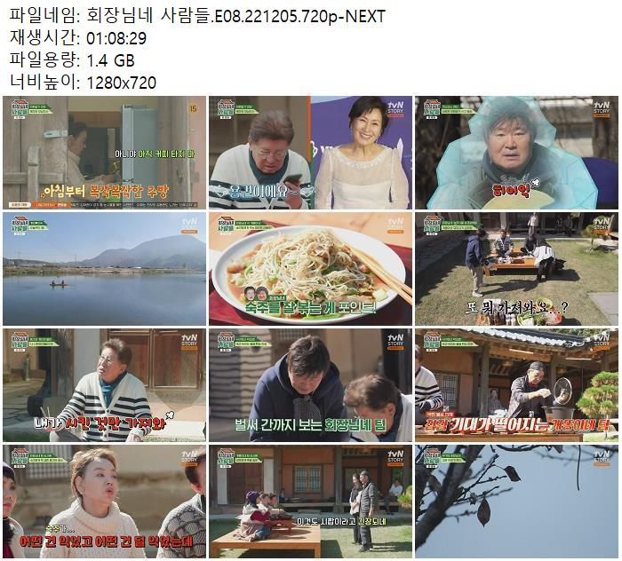 | 회장님네 사람들.E08.221205.720p-NEXT.mp4 | 1.4 G | 01:08:29 | 1280x720 |