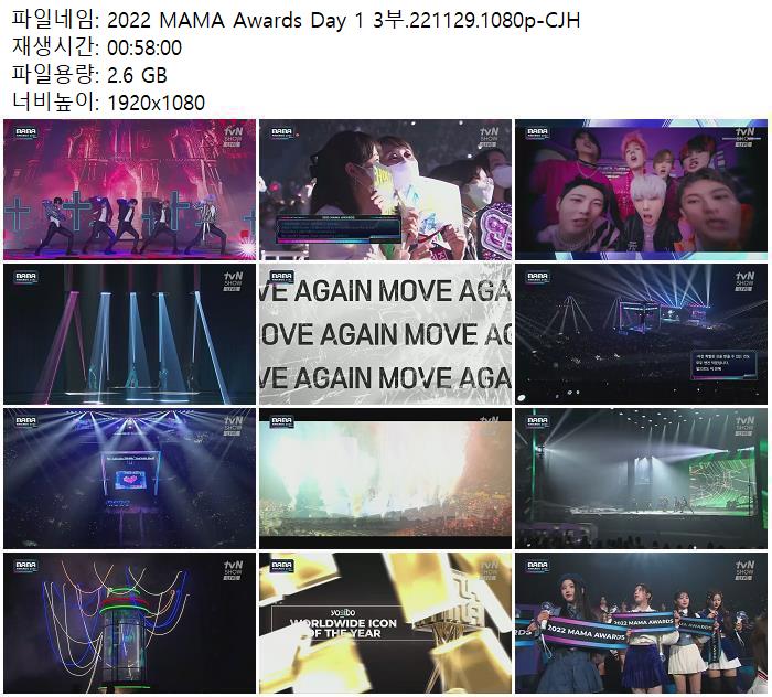 | 2022 MAMA Awards Day 1 3부.221129.1080p-CJH.mp4 | 2.6 G | 00:58:00 | 1920x1080 |