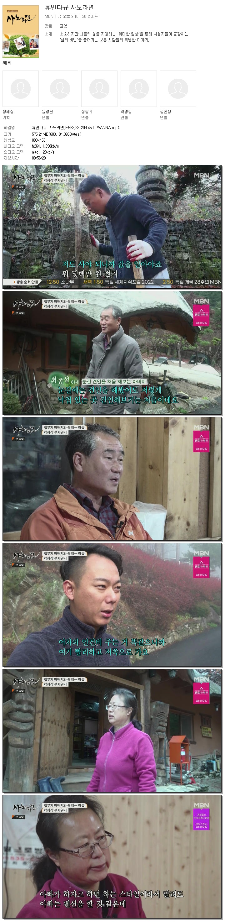 | 휴먼다큐 사노라면.E562.221209.450p.WANNA.mp4 | 575.2 M | 00:56:20 | 800x450 |