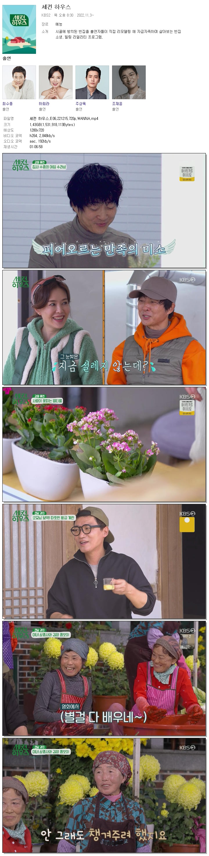 | 세컨 하우스.E06.221215.720p.WANNA.mp4 | 1.4 G | 01:06:58 | 1280x720 |